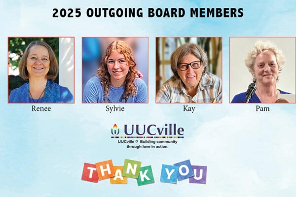 Heartfelt thanks to our outgoing UUCville board members for their dedication! We have been truly inspired by their commitment to our community—they’ve guided us with such wisdom and grace. Well done! Renee Brett – Member-At-Large Sylvie Semmelhack – Member-At-Large Kay Frazier – Treasurer Pam McIntire – President