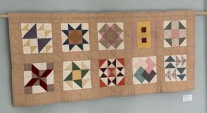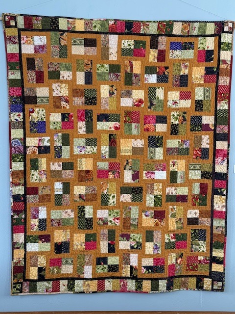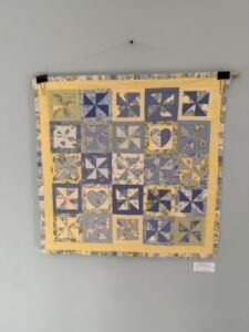 Blue & yellow cotton quilt, 33 x 33.5” $40
