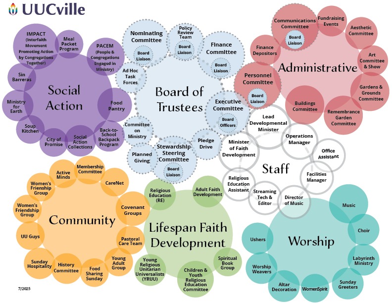 In June of 2024, UUCville unanimously adopted a long-range plan, Love into Action. The purpose of the plan is to provide the congregation with focus and accountability as it seeks to live its mission. The plan is organized around broad priorities contained in the mission statement, including: